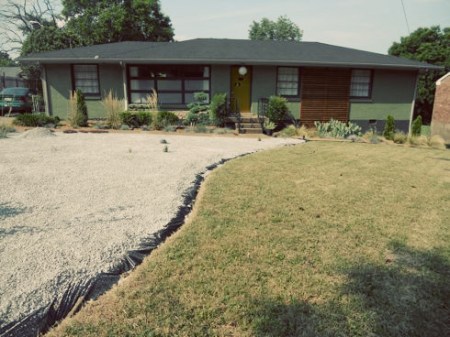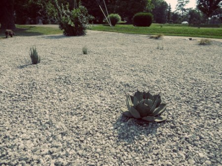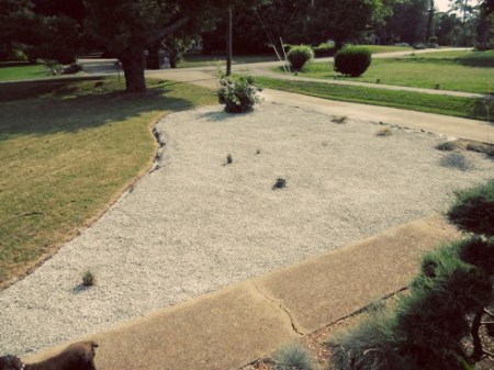 We got our gravel delivered and spread in the front garden. It’s close to being finished. Jason asked the delivery guys not to spread it all the way to the edges because he wants to had a landscaping border first, to keep the gravel from spilling into the grass. Weed eaters and pebbles are a bad combination… our front window can testify. I don’t have a whole lot to say about this since I identified the plants in the Phase 3 post. So, on with the pictures…