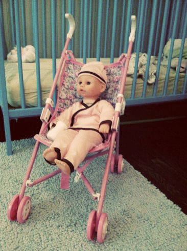 (The baby doll and stroller was a gift from my parents.)
