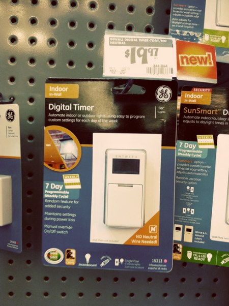 While we were piddling around at Home Depot the other day, we spotted programmable light switches. This one made by GE is only $19.97; a better deal than I found last week. We got one for the front lights at my parents house so we’ll get to test it out and see if we’d like to have one or two at our new home.