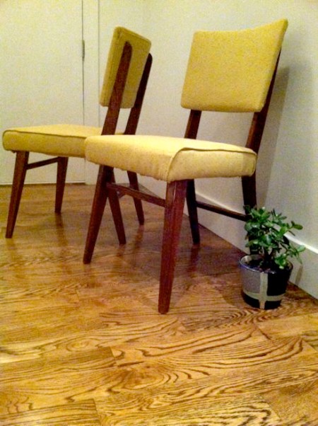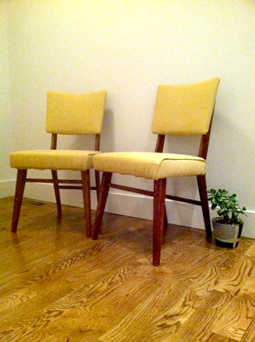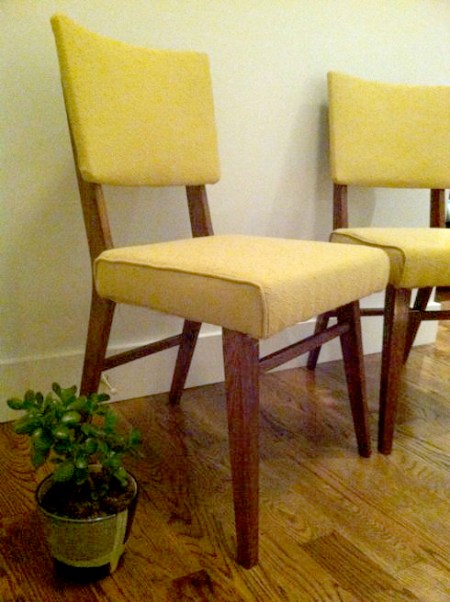 Douglas and Davy – that’s what I named this set of dining chairs. We found them at Goodwill a few weeks ago covered with stinky, tacky brown vinyl and bleached maple wood. In our first attempt at professional reupholstery (by “professional” I mean self-educated and with all the proper tools this time), we completely restored these chairs. Stripped off all of the old upholstery and padding, removed all the staples and tacks, refinished the wood legs with walnut stain, and reupholstered them with fresh padding and new upholstery. We’re quite pleased with how they turned out.