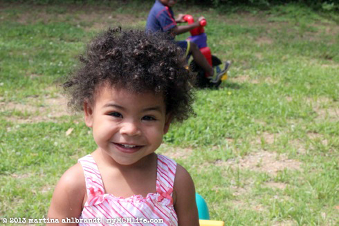 You are growing into beautiful, funny, loving, smart and outgoing little girl. You are friendly, polite and affectionate. You love music, dancing, jumping (high!), swimming, riding Dizzy, bubbles, wagon rides, slides, coloring, playing with friends and with your baby dolls and stuffed toys. You always remind us to pray before meals, holding out your hands toward us and saying “pway.” Sometimes you pray: “Jesus. Thank you. Food. Amen.” Your current favorite book is Everyone Poops, which makes you giggle a lot. You also request Choco often, as in A Mother for Choco, which is one of my favorites, too. You like to announce to everybody when “I toot!” You say dubbles instead of bubbles, meno instead of nemo, Nina instead of Nana, boop instead of book… I’ll miss those things when you finally get them all right. You’ve been really into counting and saying your ABCs lately, as well as Old McDonald Had a Farm and some other simple songs. We play our friend Phil King‘s album in the van a lot and you always sing along with “Fight On” and “Real Thing.”
