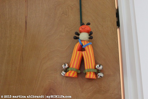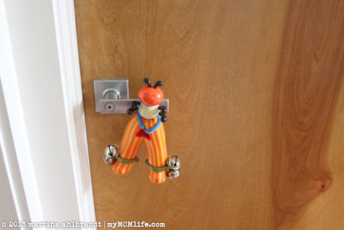 Three minutes later she came out into the hallway saying, “Mommy?” I took her back to her bed again. More sternly this time: “Stay in your bedroom. It’s time for sleeping. No crying. I’ll see you in the morning.” When I left this time I put the bells on her door handle so I’d hear if she opened the door again. She cried for less than a minute and then fell asleep.