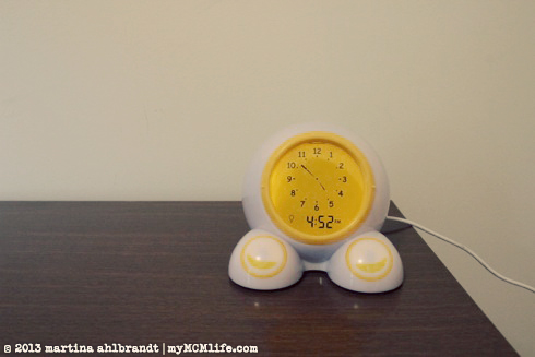 One hour later I heard her crying and rushed in concerned that she had rolled out of bed. Nope, she was just sitting up. I said, “It’s time for sleeping.” She laid down and I covered her with a blanket and turned her music on. She started to cry again as I was heading for the door. “No crying,” I said. “It’s time for sleeping. I’ll see you in the morning.” She quickly fell asleep and didn’t make another peep until morning. She got up and came looking for me about 10 minutes before the Ok to Wake light was set to come on. She had never seen it work so I waited in her room with her until it changed so she could see the difference. She’s been very excited about “light! change!” ever since.