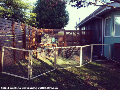 10/21/2014A simple Saturday afternoon project gave our chickens a lot more freedom. We’d been letting them out into our whole backyard sometimes, usually when we were home to supervise, because they’ve been destroying some of our garden plants and mulch beds and pooping on our patio. The worst was when Sunny, my super friendly hen, would stand at the backdoor step to look in and peck on the window, and then eventually drop a gift on the back step for us. Gross. We decided that a portable, accordion-style fence would be a good solution to give them more yard space while still protecting the areas where we spend the most time. The girls are happy and I’m happy. It’s been a couple weeks and they’ve managed to eat all of the grass pictured here. We’ll be mulching the area in the coming weeks. If any fellow backyard chicken keepers are curious, it’s 3 feet high and we’ve only had some escapes early one. One chicken in particular got to the other side several times but then was pretty stressed out about being separated from her friends. If it continues to be a problem, I’ll add a wire across the top of the fence so they’re not able to land on it. I’m pretty sure they’re not able to clear the fence without perching on it first but I’ve never seen an escape in action.