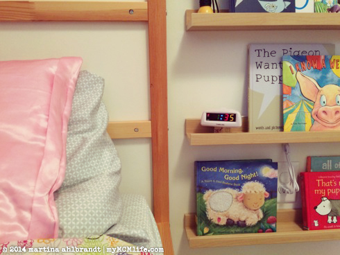 I bought a small digital clock to fit on her shallow shelves and it happened to have colored numbers. It’s actually been quite helpful in teaching her to read the time. We used to use a timer and light for “OK to come out of your room now” but we’ve been using a digital clock now that she can easily recognize numbers. With this clock it’s even easier to say, “You can get out of your bed when you see the green 8.”