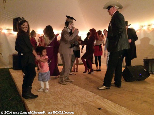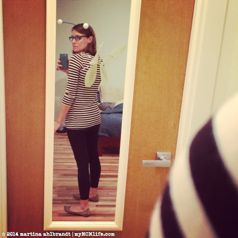 10/30/2014On Saturday night we went to a costume party with the guys Jason plays with and their families. The three bandmates dressed up as the boss, Guy Penrod. It was a hilarious surprise! We all had a great time. Ali wore her dog suit but ditched it halfway through the party before I got any photos. I had about 3 hours notice to get ready and figure out a costume so I borrowed Ali’s dress up butterfly wings and whipped up some antennae with hot gun, pipe cleaners and ping pong balls. I was a butterfly…or a bug…or a bee. I’m not sure.