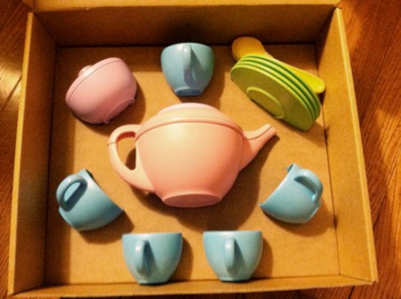 I was not familiar with Green Toys prior to this Amazon order but I’m very impressed. They’re made from recycled milk jugs, BPA, phthalates and lead-paint free—believe it or not they’re made right here in the USA. And they’re inexpensive. I think this set was a great value. For $19.99 we got a tea pot with lid, sugar bowl with lid (same as teapot’s), creamer, four saucers, four tea cups and four spoons. My favorite thing about it is probably the mix of colors: pink, purple, blue, green and yellow. It’s like Fiestware for toddlers!