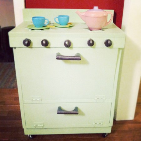 I’ve seen some great DIY play kitchens the past view years. (Here’s a round up from Ohdeedoh a few years ago.) There are also great options for sale, like the above modern wooden kitchen from Melissa & Doug, and of course the many plastic variations. A few months ago while I was yard sale hopping with my mom, I spotted this wooden play stove/oven. The only thing better than a DIY kitchen is someone else’s DIY kitchen. This stove was built by the sellers’ grandfather and I talked them down to $7, knowing it would need a lot of work to get it to a condition suitable for Ali to play with.