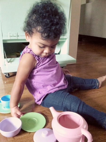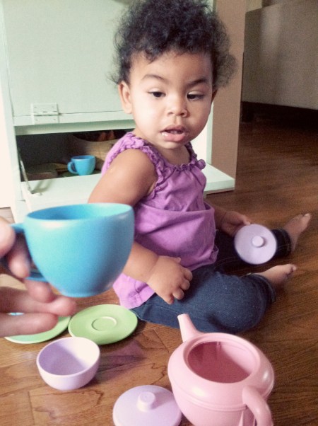 If you know me in “real life,” you know I’m a tea drinker. (Hot black tea—not herbal, not green—with a little sugar, to be exact. Republic of Tea Mango Ceylon is my all-time favorite and I’m currently out in case anyone is interested.) So naturally, I must teach my daughter all about tea. With a gift card from her adoption day, I decided to order this Green Toys Tea Set.