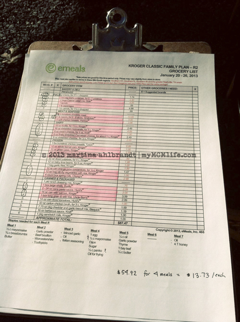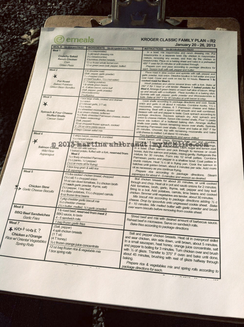 02/05/2013One of my goals for the new year, now that we’re in our new home, is to cook more. I’ve never been too much into cooking and really slacked off a lot while we were living with my parents. My mom was kind enough to let us chip in for groceries and still do a lot of the cooking she would be doing anyway—except for 5 people instead of 2. (Thanks, Mom!!) Part of what has held me back from cooking more in past years is the time to plan and shop for meals. Jason (who is a very good and creative cook!) and I would walk through the grocery store together and look for inspiration based on what was on sale. That would usually get us a meal or two and a lot of random stuff. There was a Groupon for eMeals around New Years and after discussing with a friend who as used it before, I decided that this would be my plan for 2013.