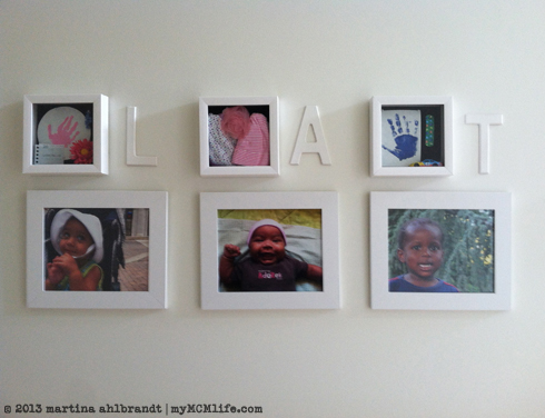 11/06/2013As I spent the month of October preparing for our fourth child, I thought a lot about our first three. I’ve had this idea for a while but finally did it: an 8×10 photo, an initial and a shadow box of significant items for each child. It’s the start of our hallway gallery wall that might one day be full of difference faces and memories.