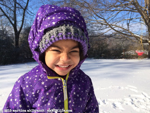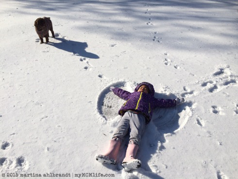 Yesterday we woke up to a dusting of real snow. I would have been happy to hide indoors all day but Alianna was so excited to make a snow angel. I couldn’t resist her enthusiasm, plus the chickens needed water, so I bundled us both up in lots of layers and we spent about 20 minutes outside playing.