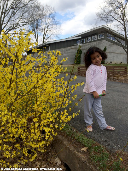 One week later the temps were in the 60s and we were playing outside with no coats. A few budding flowers have been spotted. I can’t wait until everything really bursts into bloom. Spring is so breathtakingly beautiful here. And of course, I’ve been looking forward to Spring for another little/big reason this season. AccuWeather already has the extended forecast up for my due date. It’s currently looking like April showers and upper 60s. (Seriously, how can they predict the weather a month in advance? Crazy…) I’m so thankful for the longer daylight hours in the evening brought by Daylight Saving Time and I’m trying to get some more exercise with evening walks, lots of playing outside with Ali and eating meals on the back patio whenever possible.