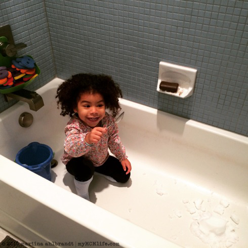 It was too stinkin’ cold to play outside that day so Ali brought a bucket of snow inside and played in the tub until it melted.