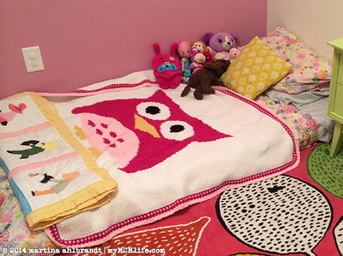 Here are a few more pics of Ali’s room to follow up yesterday’s post about her new doll house. She’s currently sleeping on a twin mattress on the floor. I’m still trying to decide if I should move the twin bed frame in from the other room or buy a new bed frame (either for her room or for the foster kids bedroom). I really like being able to snuggle up beside her to read books before bedtime. The beautiful owl blanket was made by my mother-in-law as a third birthday gift for Alianna. The quilt at the foot of her bed was made for me by my Granny when I was a baby. I love these handmade treasures!