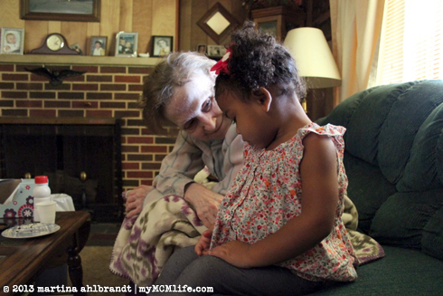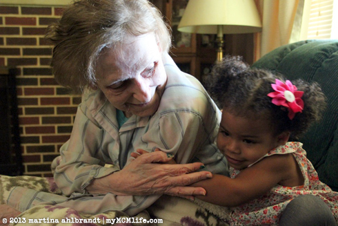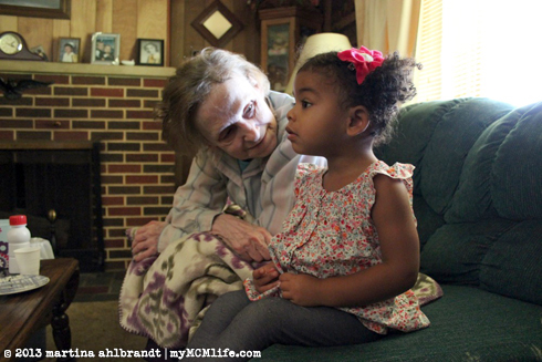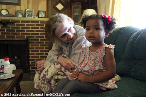 Jason’s grandmother Anna Mae Ahlbrandt lives in Erie, Pennsylvania, where we’re from. We don’t get back up there often and it occurred to us that our opportunities to introduce Alianna to her great-grandma could be running out. Last Friday these two finally had a chance to meet. They probably won’t remember this meeting but it was important to me that we captured it in photographs so we can show Ali in the future. Great-Grandma has dementia and her short term memory lasts only about 5 minutes. She asked us over and over again who we were. She really seemed to enjoy Ali and Ali did very well braving this unfamiliar and awkward situation. When we talked about it afterward, Ali’s impression was that great-grandma was sick and she was crying. She was not crying—in fact, we was smiling, joking and singing most of the time we were there—but perhaps Ali was picking up on a deeper emotion. I’m thankful we could do this and capture the moment forever.