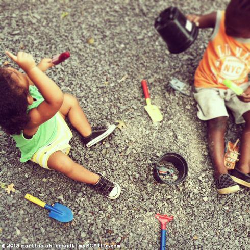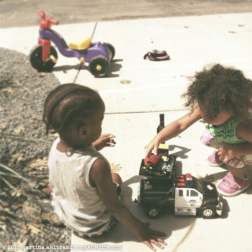 As sweet as this photo might look, I spent most of the day Saturday breaking up fights over toys between Ali and Buzz. What is it with two-year-olds? I had tons of options pulled out of the garage…cars, trucks, baseball mits, balls, bubbles, sidewalk chalk, ride-on toys…and they always want what the other one has.