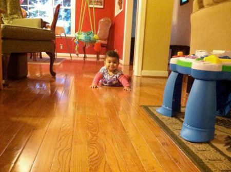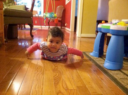 See this face? It’s the face of determination. Sometimes it helps to bite your bottom lip when you’re working on something difficult. Our Precious girl just hit a big milestone: she’s gone mobile. She learned to scoot herself backwards across the floor. She starts out either sitting up and lunges forward onto her belly or lying on her back, she rolls onto her belly. Then the sequence goes like this: