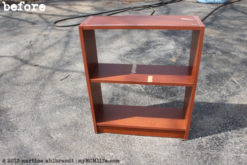 While on the hunt for a dresser for the next kids’ room, I came across this little piece of junk bookshelf. It’s pressboard with a wood patterned laminate and it was dirty and wobbly. BUT… it was only $6.99 and I couldn’t resist! I’m on the lookout for bookshelves for the kids bedrooms, the den, my office…basically, I could use a lot of bookshelves in a lot of places.