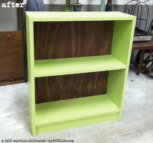 Before painting, I had added a few screws into the sides to try to stabilize it. They helped but I realized that it originally had a panel on the back, which would have helped the corners stay square. I came up with the idea of adding a piece of stained plywood to the back. We had the stain on hand. I used a rag to rub it onto the face and the edges of the plywood. When it was fairly dry (OK, not really…I was impatient…) I tacked it onto the back of the shelves with finishing nails. I really love how it turned out with the Granny Apple green and the American Walnut (color) wood. Oh, and the only thing I had to purchase was the plywood, which was around $10 and I had cut to size (from a 2’x4′ sheet) at the store. So this whole deal cost about $17.