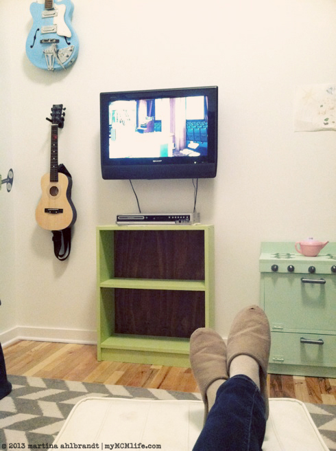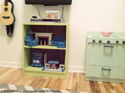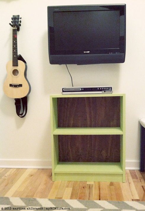 For now, it’s residing in the den. I needed a spot to put the DVD player so this room could start feeling more like a den and less like a playroom. I was also excited to have a spot to set up some of the awesome Barbie furniture my Granny made me. I could only fit about 1/4 of it on the shelf but that’s fine for now.