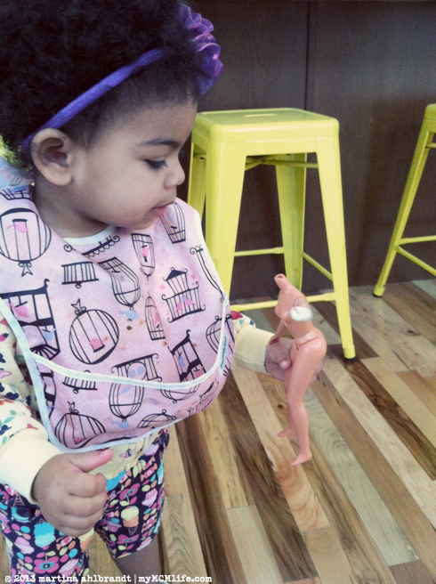 The blonde has a broken neck and Ali is quite concerned about her head popping off. She brings it to me every time and says, “Oh no, Mama!” They’re both naked, missing one limb (from a dog attack) and have butchered haircuts. Based on how rough Ali plays with them, though, I think I’ll wait a year or two before buying her any new Darbies.