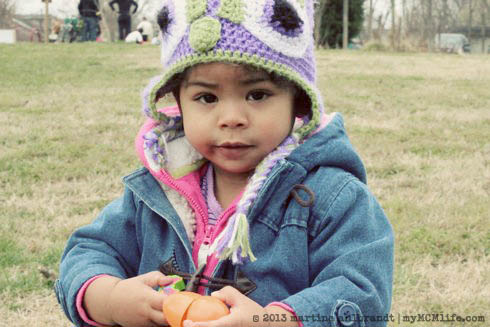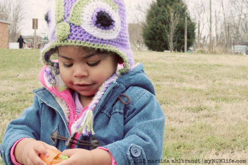 On Saturday, one of our neighborhood MOMS clubs put on an Easter egg hunt at a park. It started at 10am on a cold, dreary morning when we all slept in. We pretty much missed the hunt. When we arrived at the field, the last group was scrambling for the last set of colorful eggs. I quickly grabbed one and tossed it at Ali’s feet. She was not getting the concept so she had no sense of urgency. And thankfully, because she had no idea what an Easter egg hunt is, she wasn’t disappointed that she only got 1 measly butterfly eraser.