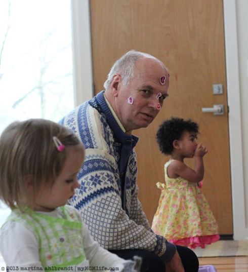 Later, my parents and in-laws came over for Easter dinner. Grandpa let Ali decorate his face with stickers. What a good sport!
