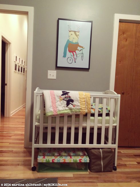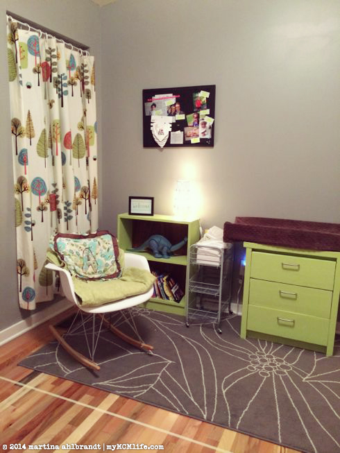 09/24/2014Yesterday I moved some furniture around to start pulling this room together. The baby side is pretty much set. I am going to sell the green dresser and move Ali’s vintage mid-century modern dresser in here just as soon as we get a bigger dresser for her room. I don’t plan to have all of that stuff in/under the crib. I would like to replace the curtain above with a light blocking one. This works OK but it’s actually a shower curtain and I’d like to get something simpler. Other than that, this area is mostly done.