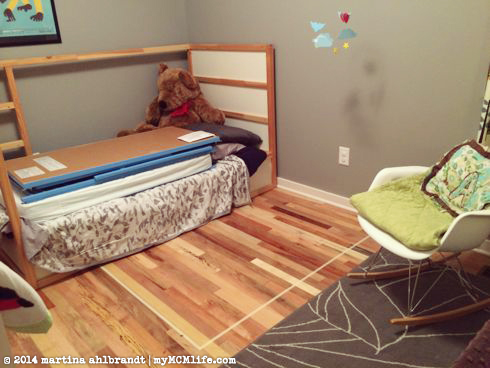 Here’s the shameful side of the room. The blue crib needs a new home but I’m too emotionally attached to it right now. I need to figure out where to hide it before Jason gets home. This bed will move into Ali’s room and we’ll put a double bed and a night stand in it’s place. I taped the floor to show where the double bed will sit. It’s going to be tight but I think it’ll work. I’m also planning on adding another rug at the side of the double bed. When we have guests we can move the crib, changing pad and changing supply cart out in less than 5 minutes. Once I sat in the rocker I realized adding a footstool would be too crowded and not necessary since I can put my feet up on the end of the bed if I want to recline.