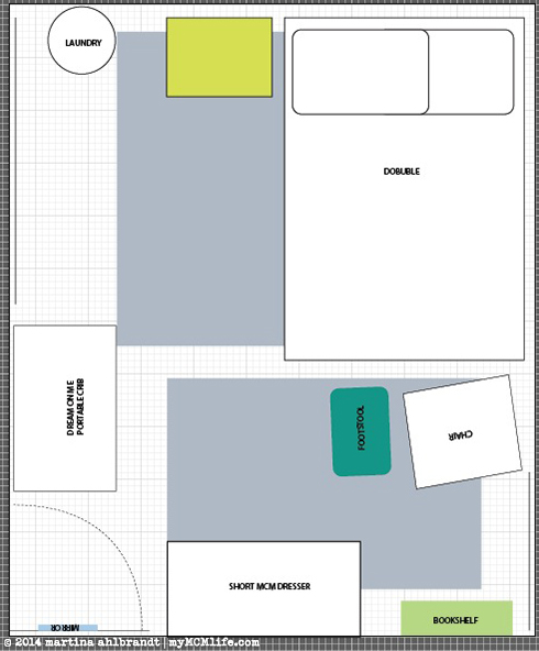 I stuck to my floor plan pretty closely but I decided that a footstool took up unnecessary space.