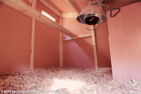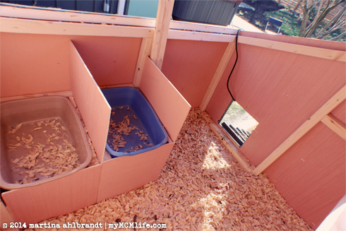 • The nesting boxes are 1′ off the floor with about 1.5′ of head space; we’re using small cat litter boxes