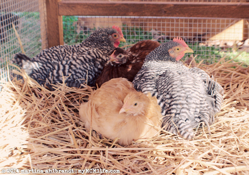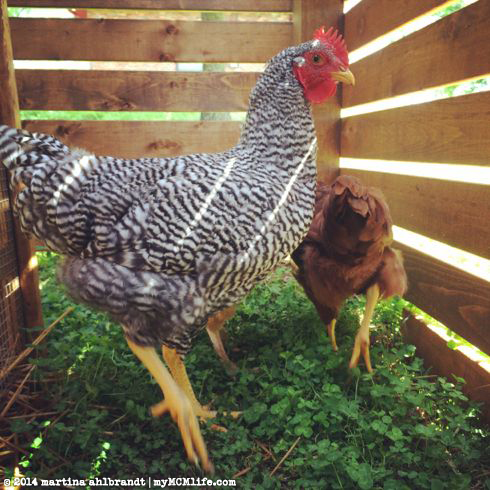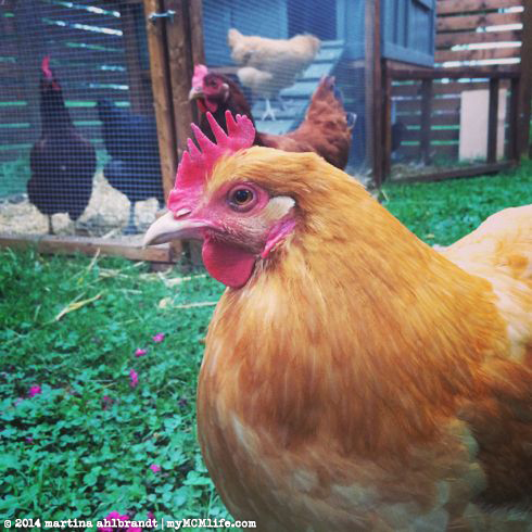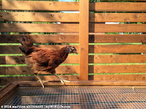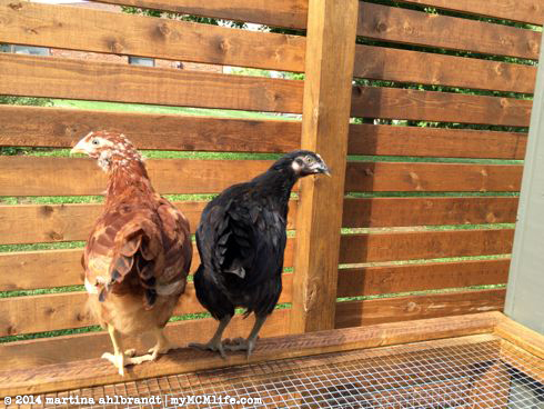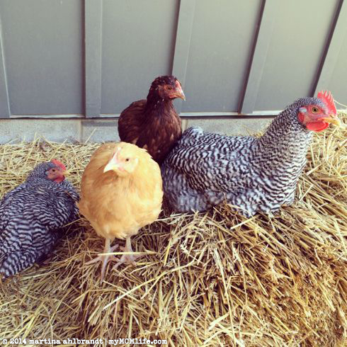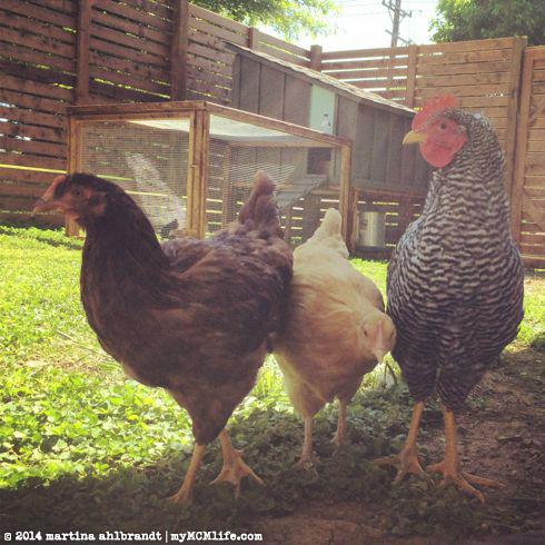 Our girls seem to be very happy with their new home, though they also love roaming the backyard when we give them the chance. Left to right: Quiche (Plymouth Rock), Meringue (Rhode Island Red), Sunny S.U. (Buff Orpington) and Soufflé (Plymouth Rock). They’re just about 2 months old in this picture.