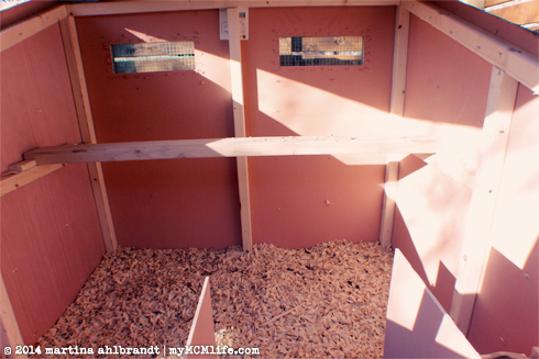 • The roosting bar is about 2 or 2.5′ off the floor of the coop, with about 1.5′ of head space