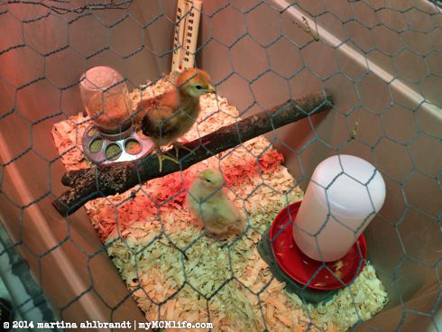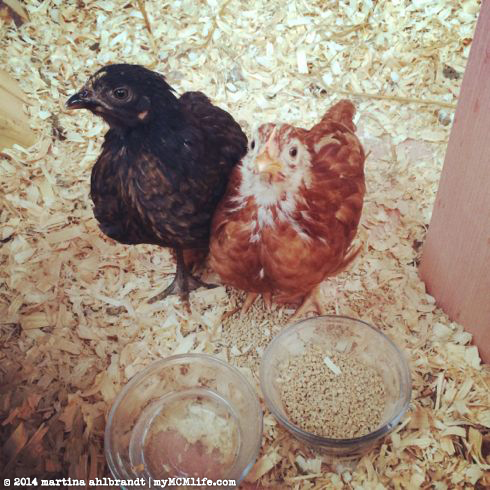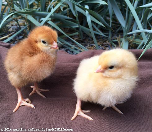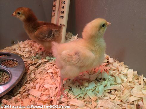 • Added two more 1-day old chicks — 1 RIR (Frittata) and 1 Buff Orp (Omlet) because both of our Plymouth Rock straight run chicks started crowing. Dang. End of April.
