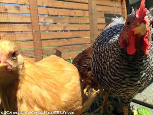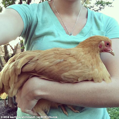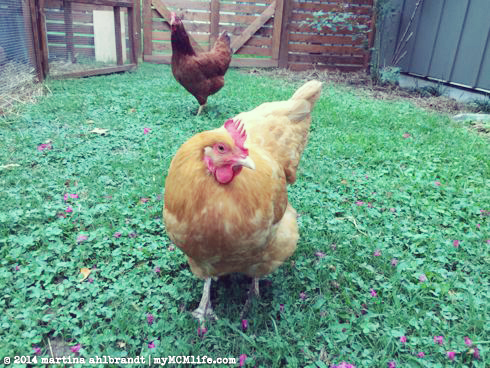 As of yesterday, four of our six hens are laying eggs. I’m hoping now that we’re up to 3-4 a day we’ll have enough to share with family and friends. August brought a lot of long, hot days and I tried to let the girls out of their run to roam the backyard for a bit everyday. We don’t let them out all the time because they’ll eat all our plants and poop all over everything if we don’t supervise or limit the time. But they love to run and flap their wings and roll around in the mulch to take dust baths (necessary to keep cool and shake pests off their skin). Plus, I love to interact with them. They’ll come up to the back door to look into the living room and sometimes my favorite girl Sunny S.U. will even knock on the window with her beak to say hello.