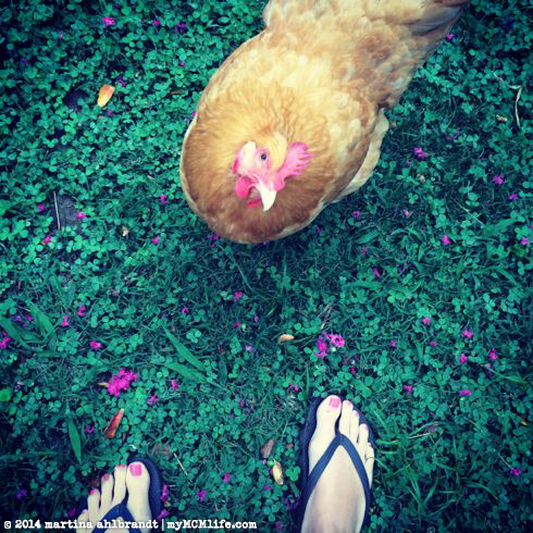 Then there is Sunny. Buff Orpingtons are known to be friendly chickens but I’m amazed at how different she is than the others. She’s never been afraid of me. While I was sitting on the steps throwing berries out to the distant ones, I realized she was standing quietly right by my feet. She wasn’t scared. She wasn’t impatient or greedy, pecking at my stash or me, as they sometimes do. I can reach down and pet her soft feathers and she’s never backs away. She was peaceful and content to stand by me and wait for any treats I might offer. I have six birds but my sweet, faithful Sunny got half of the berries.