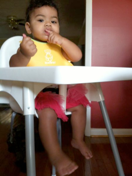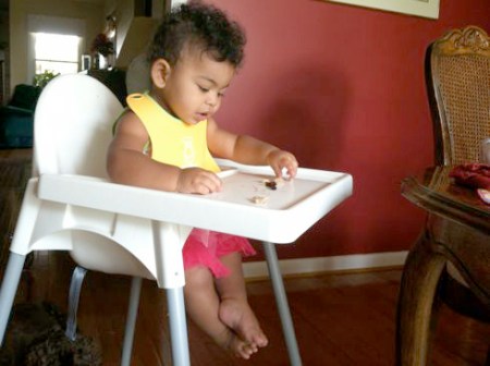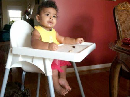 I think every baby should come with a dog. It’s a great partnership. Lucy (the dog) doesn’t even like Precious (the baby) and they still have a beautiful thing going. Precious is delighted by Lucy…watching her, chasing her, occasionally catching up fast enough to get a quick feel of her soft fur. Lucy gets more exercise these days, now that Precious is on the move. But the exercise is good because she’s always eating a lot more table food than she used to (which was hardly any). Lucy is actually a very picky eater, but Precious will eat anything. Lucy is quick to clean up Cheerios, bread, cheese or yogurt off the floor. If Precious drops blueberries, green beans, peas or carrots, however, we’ll have to pick those up ourselves. Lucy sits below the high chair and stares at the rug, waiting for a Cheerio to bounce and roll…