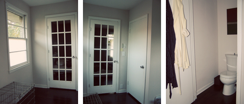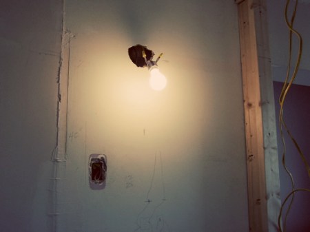 Lights installed … almost. The ceiling light that was formerly in the bathroom, which was once a bedroom, is now dangling a foot from the ceiling in the laundry room. So helpful when I’m doing laundry at night! Also, there is a light in the bathroom now, above the vanity, but it’s essentially just a light bulb hanging out of the wall. Better than the floor lamp we’ve been using!