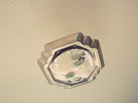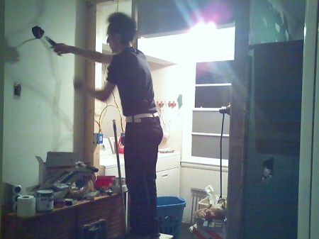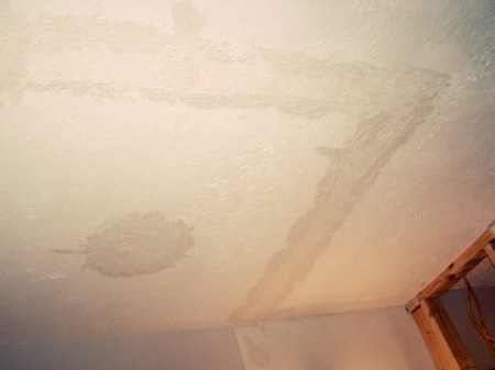 Holes in the ceiling have been patched up. Moving lights around and taking down walls created several big holes in the ceiling. Jason’s been patching and matching the lovely (not) spiky texture.
