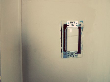 Electricity has been run to the shower light, shower fan, and the light above the vanity. Check out this sweet 3 switches in 1 thing. (What’s it called again!?) Saved us (Jason) from having to cut out a bigger hole in the wall for a new electrical work box.