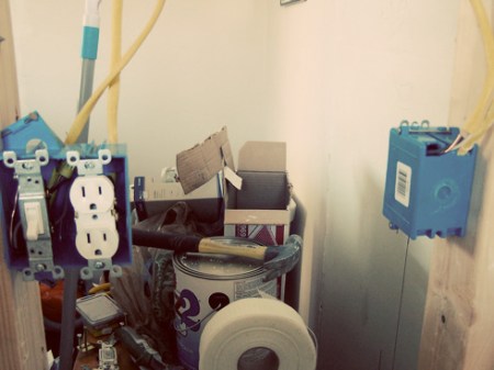 Electricity has been run to a light in the laundry room (I still can’t believe I have a laundry ROOM!), an outlet in the laundry room and an outlet by the sink in the bathroom.