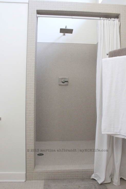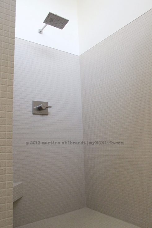 The shower fan & light was installed in the shower. (More adventures of being wedged into a tiny space in the attic. But we do love our low-slung roof.)