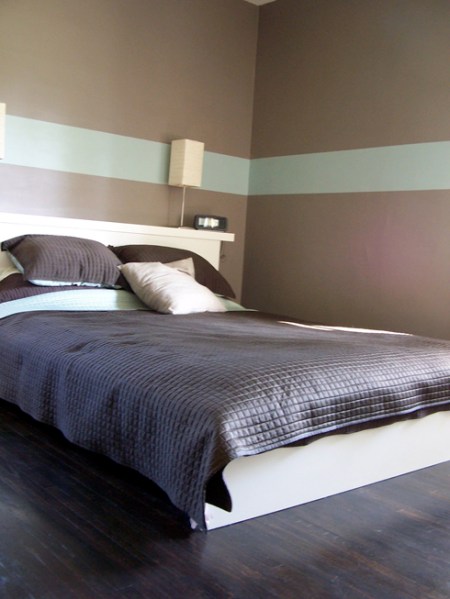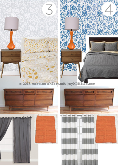 I have started collecting inspiration, though. We definitely want to do an accent wall behind the bed, most likely with wallpaper. I didn’t take a photo of the headboard yet but its the same color wood as the dresser with a black horizontal stripe. We have lamps that we want to use but need a fresh coat of spray paint. I’m stuck on orange for some reason. I sent Jason these two initial ideas.