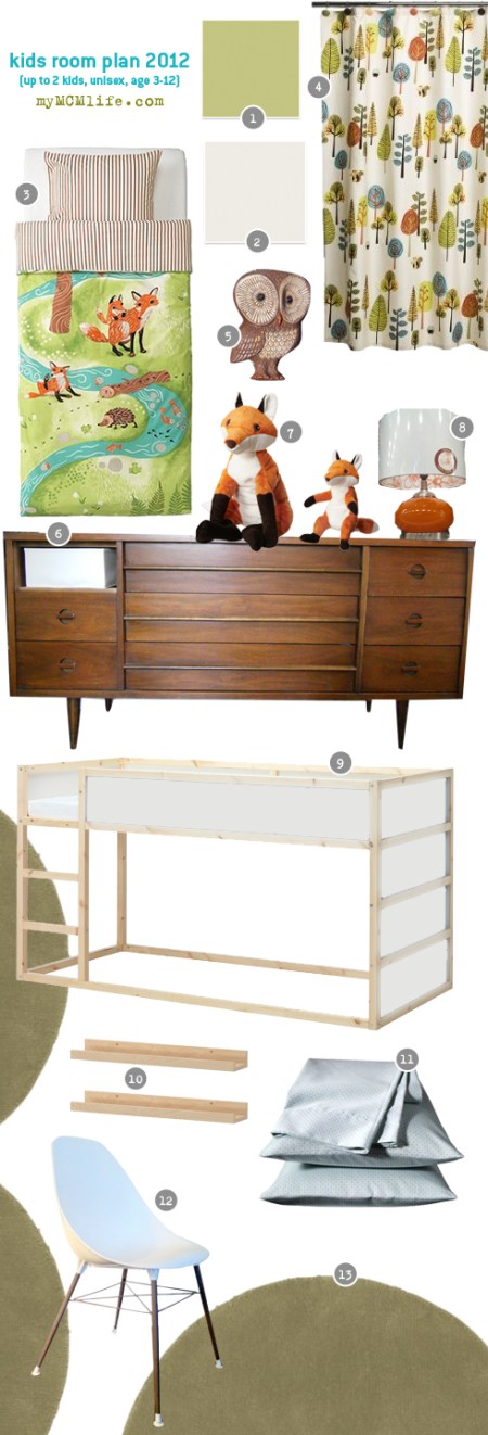 At our last house, I designed a combined nursery and kids room as we were becoming foster parents. It had to be suited for 1 or 2 kids, either gender, newborn up to age 5…all within a 10×11 bedroom. In our new house, we’ll have a nursery for Precious and another bedroom that’s set up for our future foster kids. I’m not really sure what parameters we’ll set next time around so I’m planning this room for 1 or 2 kids, boys or girls, ages 2-12. The room is approximately 10×12. We already own the bed, dresser, curtain, book ledges, owl, sheets and chair. The rest would be new purchases.