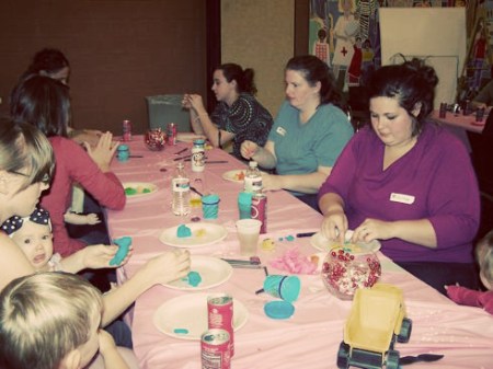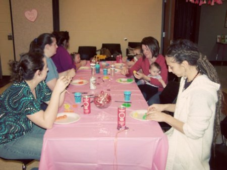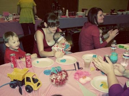 The favor and craft table. We had two crafty activities: a hair accessory making station and a bunch of handmade Valentines and a mailbox for welcome notes and prayers for baby Eliza.