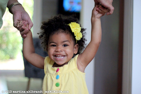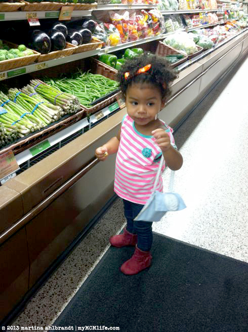 I took this little lady grocery shopping with me the other day. We weren’t in a rush and the store wasn’t busy so when she didn’t want to ride in the shopping cart I decided to let her walk for the first time. She got so much attention with her stylish boots, little purse, (Dora sticker on her face…) and her out-going personality. I think she said hi to every person in the store and had at least 5 conversations about how old she is and what her name. She was thrilled to look at the live lobsters and knew what they were (maybe from shopping with her daddy, I’ve never talked to her about them before). I would hand her a item, like an orange or a box of rice, and she would drop it into the cart for me. I even let her choose a couple things for me… red grapes or green grapes? (She chose red.) Mac and cheese in a fun shape. Fruit snacks (her new obsession), even though we had a box at home. She carried the fruit snacks under her arm for the duration of our shopping. She told me she was carrying them in her armpit. She was usually trailing 5-10 feet behind me as I walked up and down the aisles pushing our cart. At one point I looked back and noticed she would take a few steps, turn around in a circle, take a few more steps, turn in a circle. She has such a passion for life and an incredible joy even at the small things. I decided to follow her lead…take a few steps, turn in a circle, take a few steps, turn in a circle. Her vitality is contagious. And she thought it was pretty great, too.