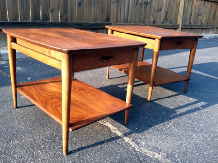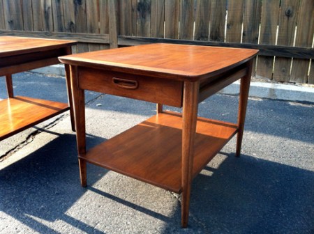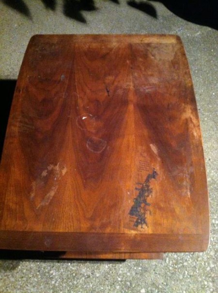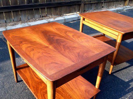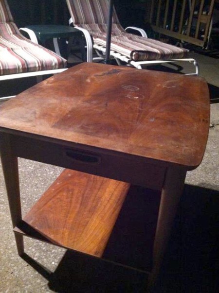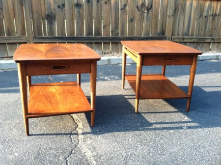 Jason and I were blessed to inherit a few pieces of furniture from his mom’s mom’s home after she passed away. These two Lane end tables were in rough shape. Both had watermarks on top and one was stained with newsprint.