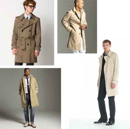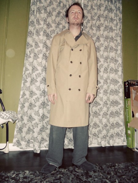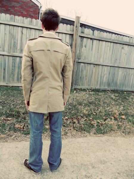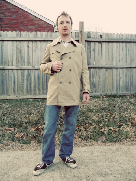 After a little research in the form of a Google image search, we decided it was too long. It needed to hit above the knee. (Though you can find plenty of longer mens trench coats, too.) Even these coats were a little too long for Jason’s taste. After snipping off 10″ or so and sewing the hem, we realized it was still too wide. I took in the seam in the middle of the back (not so much that I’d have to redo any of the work across the shoulders), made the sleeves narrower and shorter, and removed the bottom button and closed up the button hole.