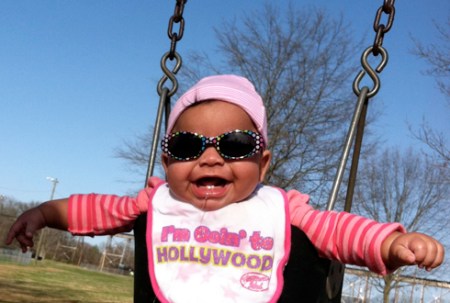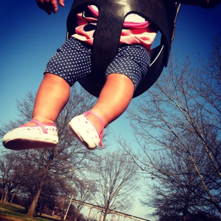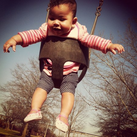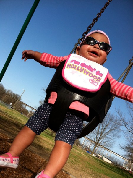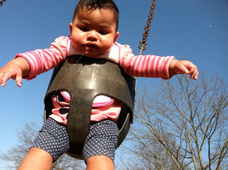 We took Precious to the playground for the first time last week since the weather has been reaching into the upper 60s and low 70s more frequently here in Nashville. She seemed to really enjoy the swings. Not much reaction to the slide and that’s about all she’s big enough for yet. So lots of swing pictures pictures…